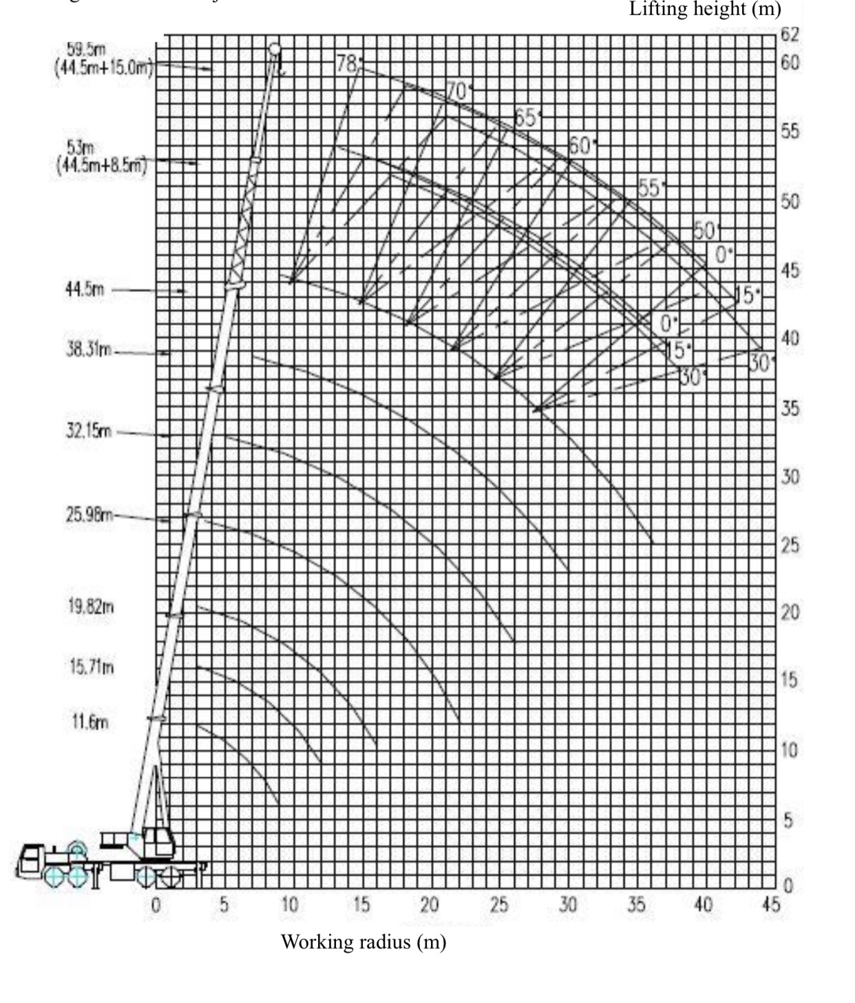 | Fully extended boom+ jib | m | 59.5 |